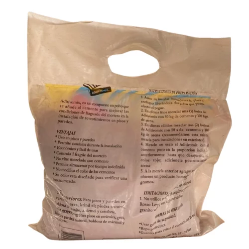 ADITIVO MIX BOLSA es un compuesto en polvo que se añade al cemento para mejorar las condiciones de fraguado del mortero en la instalación de revestimientos en pisos y paredes.